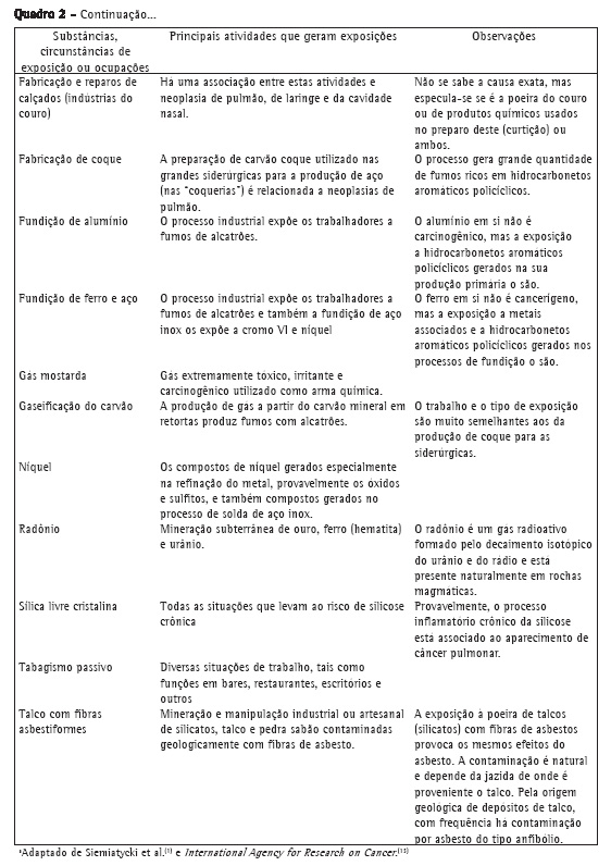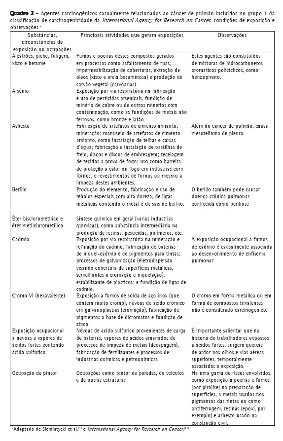 Os estudos da IARC mostram que o câncer de pulmão, além das inúmeras causas ligadas à ocupação, está ligado a hábitos, como o tabagismo, ou a circunstâncias de exposição, tais como emissões da combustão doméstica de carvão. Há 20 agentes entre as substâncias, misturas ou ocupações relacionadas ao câncer de pulmão. Ainda existem vários outros agentes relacionados no grupo 2A, ou seja, que são provavelmente cancerígenos para o ser humano, e muitos deles poderão vir a ser incluídos no grupo 1 nos próximos anos. O presente artigo de revisão tratará somente dos agentes do grupo 1, o qual não dá margem a especulações, e relacionados ao câncer de pulmão, podendo-se estabelecer, dessa forma, uma relação mais objetiva entre a doença e o agente. O Quadro 2 lista os 20 agentes citados.