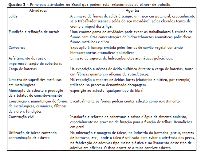 Com a finalidade de facilitar a tarefa de obtenção de informações sobre os agentes carcinogênicos com os quais um paciente possa ter tido contato, foi elaborada uma lista com algumas atividades e ocupações comuns no Brasil e que podem gerar exposições a agentes classificados no grupo 1 da IARC (Quadro 3), além das ocupações por si só classificadas como carcinogênicas para o pulmão (Quadro 2).