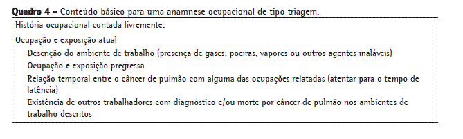 Toda rotina anamnéstica ocupacional deve incluir o questionamento panorâmico inicial e sumário, mas não por isso menos abrangente, das ocupações presentes, das ocupações passadas e das exposições específicas que são reconhecidas como de maior risco ocupacional para a ocorrência de câncer de pulmão, como a presença de fumos, gases, poeiras e outros aerossóis no ambiente de trabalho (ver sugestão de roteiro no Quadro 4).