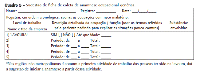 No momento que uma hipótese de etiologia ocupacional é feita e uma exposição suspeita é identificada na triagem, os ambientes de trabalho frequentados pelo paciente e as ocupações exercidas em sua vida laboral deverão ser detalhados.(32) Para tanto, um tempo adequado dentro da consulta deve ser reservado. Não é possível se obter informações de qualidade apressadamente. Esse detalhamento deverá seguir um roteiro que abranja temporalmente desde o primeiro emprego até o atual, de preferência utilizando-se uma planilha de coleta de dados padronizada e previamente estabelecida (sugestão no Quadro 5). Essa etapa deve contemplar: