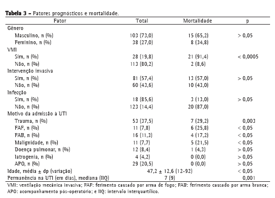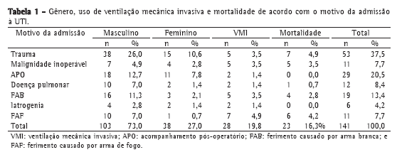 O motivo pelo qual os pacientes são admitidos à UTI é um dos fatores básicos que influenciam a mortalidade nesses pacientes. Está intimamente associado à abordagem adotada e à morbidade. Em um estudo envolvendo 5.030 pacientes de UTI médica ou cirúrgica, relatou-se uma taxa anual de mortalidade ≥ 40%.(6) Considerando os casos admitidos a nossa UTI, o motivo mais comum pelo qual os pacientes foram admitidos foi trauma torácico. Os acidentes de trânsito foram responsáveis pela maioria dos casos, e houve trauma secundário em 34 casos devido a ferimento penetrante no tórax. Dos 53 pacientes com trauma, 38 (26%) eram do sexo masculino. Entretanto, não se detectou nenhuma associação significativa entre o sexo masculino e a mortalidade devido a trauma. Em um estudo investigando pacientes com DPOC e pacientes com SARA,(10) a taxa de mortalidade foi de 34%, aumentando para 46% quando a VM invasiva foi também considerada.