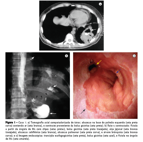 Um paciente do sexo masculino com 44 anos de idade submeteu-se à cirurgia de Fobi-Capella por videolaparoscopia para controle da obesidade mórbida, sendo reoperado após 48 h para tratamento de obstrução intestinal. Dois meses depois, foram realizadas duas sessões de dilatação endoscópica com balão para correção de estenose da anastomose gastrojejunal. Em seguida, o paciente apresentou quadro de vômica, tosse produtiva, febre e dor à inspiração profunda na região tóraco-abdominal esquerda, sendo diagnosticada uma imagem nodular de 7 cm de diâmetro, em base pulmonar esquerda, por meio de tomografia axial computadorizada de tórax (Figura 1a). O paciente apresentou melhora clínica após antibioticoterapia, fisioterapia respiratória e acompanhamento no serviço de pneumologia. Porém, houve duas recidivas num intervalo de três meses, quando então foi diagnosticada uma fístula gastrobrônquica por meio de imagem radiológica (Figura 1b) e endoscópica (Figura 1c) que evidenciou um orifício com 10 mm de diâmetro no ângulo de His, através do qual foi possível a passagem do endoscópio até uma pequena cavidade subfrênica onde se visualizava um orifício interno do trajeto fistuloso para a árvore brônquica. Não houve sucesso na tentativa de correção via laparotomia, sendo realizada apenas uma gastrostomia no estômago excluso para nutrição. Assim, usando bisturi elétrico, realizou-se a secção endoscópica da estenose gástrica e do septo situado entre a fístula e a bolsa gástrica associada à dilatação com balão de 20 e 30 mm (Boston Microvasive, Boston, MA, EUA) e aplicação de clipes na fístula (Olympus Corp., Tokyo, Japão). Após seis meses, observou-se aumento do diâmetro da bolsa gástrica, desaparecimento do referido septo e fechamento definitivo da fístula com resolução do abscesso pulmonar.