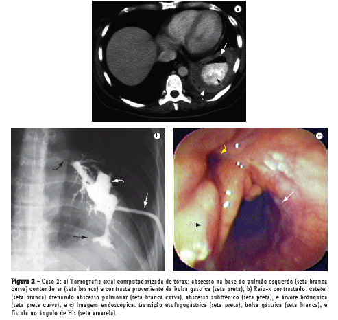 Uma paciente com 44 anos de idade foi submetida à gastroplastia vertical com anel (sleeve gastrectomy) por videolaparoscopia, evoluindo com fístula gástrica e cinco episódios de abscesso subfrênico durante 8 meses. Seu quadro clínico se iniciava com dor no ombro esquerdo e evoluía com febre, tosse, leucocitose, queda do estado geral e perda de peso excessiva. Os dois últimos episódios foram acompanhados de tosse com expectoração purulenta e a tomografia axial computadorizada de tórax diagnosticou abscesso na base pulmonar esquerda (Figura 2a), secundário a abscesso subfrênico a partir do ângulo de His, e estenose gástrica ao nível do anel e da incisura angularis. O abscesso pulmonar proveniente da fístula gastrobrônquica foi drenado através de cateter visualizado em radiografia contrastada (Figura 2b) e a imagem endoscópica mostra o orifício interno da fístula no ângulo de His (Figura 2c).