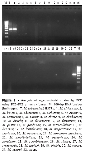 The mycobacterial strains and clinical samples were inactivated at 95 °C for 10 min. The DNA was extracted using QIAamp Tissue DNA Kit (Qiagen, Hilden, Germany), according to the manufacturer's instructions. Purified DNA (10 µl) was added to 40 µl of reaction mixture containing 20 mM Tris-HCl (pH 8.4), 50 mM KCl, 2.0 mM MgCl2, 1.0 U Platinum Taq DNA polymerase (Invitrogen Life Technologies, Gaithersburg, MD, USA), and 0.2 mM dNTPs (Invitrogen Life Technologies), together with 10 pmol each of the primers BC3 (5'-TCGACGGCAGAAAGCGTGCC-3') and BC5 (5'-GCGGCTCAATGCGCTTCCG-3'). The primers BC3 (complement of bases 200266 to 200285) and BC5 (bases 200679 to 200697), which are based on the M. tuberculosis H37Rv sequence (EMBL accession number BX842579), amplified a 432-bp DNA fragment comprising the 3' end of the plcB gene, the intergenic region, and the 5' end of the plcC gene. PCR amplification was performed as follows: initial denaturation at 94 °C for 5 min; 35 cycles of denaturation at 94 °C for 30 s, annealing at 65 °C for 30 s, extension at 72 °C for 30 s; and a final extension step at 72 °C for 5 min. The PCR products were analyzed by agarose gel electrophoresis (2% w/v) and stained with ethidium bromide. The clinical samples were also amplified with specific primers for human ß-globin gene GH20 and PC04(22) in order to detect inhibitory samples.