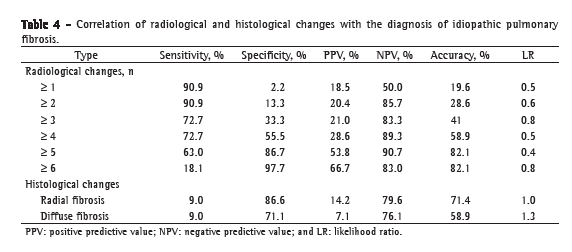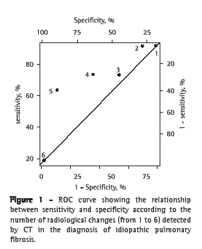 In the present study, honeycombing was the least common radiological finding (14%). However, the presence of honeycombing was highly suggestive of IPF (p = 0.01). Although nodules are extremely common in ILDs, they are uncommon in IPF. Nodules are most common in sarcoidosis, showing high sensitivity (86%). In the absence of this lesion, the possibility of sarcoidosis is more remote (NPV = 90%). The presence of at least six radiological changes had a PPV of 67% for IPF, a value very similar to that found in another study (71%).(18) The PPV increased as the number of changes increased. However, the ROC curve showed that the best relationship between sensitivity and specificity occurred when five changes were present. This difference shows the need for qualifying such changes. Although the number of radiological changes is important, the patterns observed must be those that the literature associates with high specificity for IPF, such as honeycombing.(18-20)