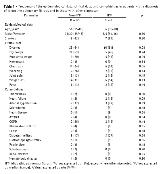 DiscussionIn the present study, the patients suspected of having ILD presented with a highly prevalent clinical and epidemiological profile, meaning that age, gender, prevalence of dyspnea, and prevalence of chest pain were similar to those reported in studies conducted at other referral centers.(15) The same was observed for the patients with IPF.(16,17)
