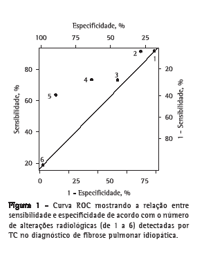 O estudo das alterações radiológicas mostrou que o achado favo de mel foi menos frequente no presente estudo (14%). No entanto, quando presente, esse foi fortemente sugestivo de FPI (p = 0,01). Os nódulos, por sua vez, são muito frequentes nas DPIs, mas pouco vistos na FPI, sendo mais comuns na sarcoidose, com alta sensibilidade (86%). Na ausência dessa lesão, a possibilidade de sarcoidose já é mais remota (VPN = 90%). O VPP de 67% para FPI, quando no mínimo seis alterações radiológicas eram incluídas, demonstrou um valor muito semelhante ao encontrado em outro estudo (71%).(18) O VPP aumentou com o maior número de alterações. No entanto, a curva ROC mostrou que a melhor relação entre sensibilidade e especificidade ocorreu na presença de cinco alterações. Essa diferença evidencia a necessidade da qualificação dessas alterações. Ainda que a quantidade de alterações radiológicas seja importante, é necessário que os padrões apresentados sejam aqueles associados com alta especificidade à FPI pela literatura, como o favo de mel.(18-20)