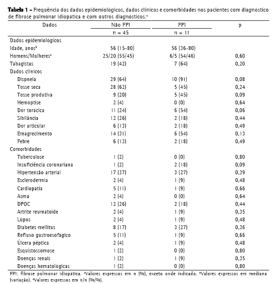 No período avaliado, 86 pacientes foram submetidos a BTB, sendo que 56 (65,1%) foram compatíveis com os critérios de inclusão no estudo, e 11 (19,6%) receberam o diagnóstico final de FPI. Dos 56 pacientes, 25 (45%) eram mulheres e 31 (55%) eram homens, com mediana de idade de 56 anos (variação: 15-80 anos). Dos 56 pacientes, 11 (19,6%) tinham idade inferior a 40 anos, sendo que, para esse grupo, a principal hipótese diagnóstica inicial era sarcoidose (5/11; 45,4%). Entre aqueles com diagnóstico final de FPI, a mediana de idade também foi de 56 anos (variação: 36-80 anos), sendo que apenas 1 paciente tinha menos de 40 anos, o qual possuía suspeita clínica de DPI. Dispneia (70%), tosse seca (59%) e emagrecimento (36%) foram os sintomas mais frequentes. O tabagismo estava presente em 26 pacientes (46%). As principais comorbidades foram hipertensão (36%), DPOC (25%) e diabetes mellitus (20%). As doenças autoimunes, como lúpus eritematoso sistêmico, artrite reumatoide e esclerodermia, estavam presentes em 14% dos pacientes. Na comparação entre os pacientes com diagnóstico final de FPI e aqueles com outros diagnósticos, houve diferenças significativamente maiores quanto à frequência de dispneia (91% vs. 64%; p = 0,08), de dor torácica (54% vs. 24%; p = 0,06) e de tosse produtiva (45% vs. 20%; p = 0,09), mas sem diferença significativa entre as comorbidades (Tabela 1).