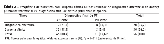 A principal hipótese clínica foi DPI específica, em 36 pacientes (64,3%), e somente 3 desses pacientes foram diagnosticados com FPI (p = 0,011; Tabela 2).