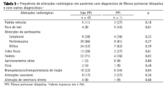 Os achados radiológicos mais frequentemente observados foram distorção do parênquima (peribrônquica), em 69,9%; nódulos, em 64,3%; e distorção do parênquima (difusa), em 55,4%. Nos pacientes com diagnóstico final de FPI, distorção do parênquima (peribrônquica), em 81,8%; distorção do parênquima (difusa), em 63,6%; e bronquiectasias de tração, em 54,5%, foram os mais frequentes (Tabela 3). Os nódulos contribuíram significativamente para excluir o diagnóstico de FPI (p = 0,03), enquanto o aspecto de favo de mel e a bronquiectasia de tração o favoreceram (p = 0,01 e p = 0,043, respectivamente).