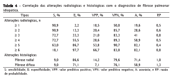 As comparações entre as frequências das variáveis histológicas, radiológicas e clínicas foram realizadas com o teste do qui-quadrado ou o teste exato de Fisher bicaudal, quando apropriado. O nível de significância adotado foi de p < 0,05. Para os testes diagnósticos, calculou-se sensibilidade, especificidade, valor preditivo positivo (VPP), valor preditivo negativo (VPN), acurácia e razão de probabilidade, quando apropriado, adotando-se como a prevalência de FPI aquela obtida em nosso hospital para este estudo. Além disso, a curva ROC foi construída baseada no número de alterações radiológicas sugestivas de DPI. A análise dos dados foi realizada utilizando-se o Statistical Package for the Social Sciences, versão 15.0 (SPSS Inc., Chicago, IL, EUA).