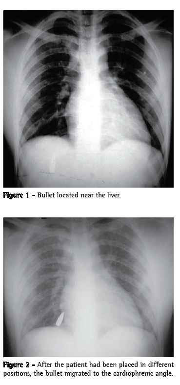 In cases of gunshot victims in which there is no exit wound and the bullet is not found in the expected place, the possibility of the bullet having migrated should be considered. As any other foreign body, bullets free in the pleural space are subject to the force of gravity and move according to the patient position until they lodge in a given place. Such injuries can be accompanied by pneumothorax or hemothorax. On X-rays taken with the patient standing, the bullet typically appears at the lowest possible position within the pleural cavity and is occasionally misinterpreted as being located in the abdomen. In the acute phase of the lesion, an X-ray taken in the lateral decubitus position reveals the change in the position of the metallic foreign body free in the pleural cavity. In the late phase, usually, the irritation process causes fibrous adherences that have the end result of lodging the foreign body in the point of greatest declination.(4,5)