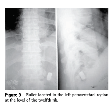 A 25-year-old male patient with a gunshot wound was transferred from another hospital. The entry wound was located in the fifth intercostal space, in the midaxillary line. Upon admission to the emergency room, the patient was lucid, with good color, and well hydrated, presenting a strong, regular pulse and an arterial pressure of 120/80 mmHg. Subsequent routine X-rays of the chest and abdomen revealed a small left hemothorax and a bullet located in the paravertebral region (left costovertebral diaphragm recess) at the level of the twelfth rib (Figure 3). The patient underwent left water-sealed intercostal drainage, with an outflow of 300 mL of blood, and supraumbilical midline laparotomy. The diaphragm was intact, and no abdominal lesions were found. The chest drain was removed 48 h later. At that time, a surgical consult was requested.