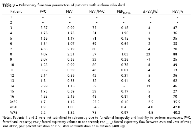 This was a descriptive, retrospective, observational study in which data were collected from the clinical charts and death certificates of 16 patients with asthma monitored at the ProAr Referral Center who ultimately died between December of 2003 and June of 2006. Primary and secondary causes related to mortality, as well as place and time of death, were collected from the death certificates. Demographic and clinical characteristics, as well as details regarding asthma treatment, were collected from the ProAr outpatient clinical charts.