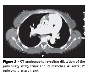 Clinically, PH syndrome manifests as dyspnea, oppressive chest pain, or syncope on exertion; radiologically, it manifests as dilatation of the pulmonary arteries and trunk; and, echocardiographically, it manifests as increased pulmonary artery systolic pressure, calculated on the basis of the tricuspid regurgitant jet velocity and the right atrial pressure.(4,6)