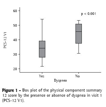The comparison of the mean PCS-12 scores only revealed statistical significance when they were compared in terms of the presence of dyspnea (presence of dyspnea 34.4 ± 8.1; absence of dyspnea 43.4 ± 7.9; p < 0.001) and BDI (BDI = 8; 34.1 ± 6.9 and BDI > 8; 41.2 ± 9.9; p < 0.009). The differentiation of the PCS-12 regarding gender, BMI, pattern of cutaneous involvement, pulmonary involvement, pulmonary function, and distance covered was not significant, and neither were any of the mean MCS-12 scores (data not shown). A box plot of the PCS-12 scores in relation to the presence of dyspnea is shown in Figure 1.