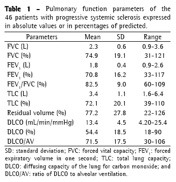 Progressive systemic sclerosis (PSS) is a chronic autoimmune disease that is characterized by excessive production of collagen, endothelial cell damage, and microvascular obliteration, and usually leads to progressive cutaneous-mucosal fibrosis and visceral involvement.(1) Pulmonary involvement is common and results in high rates of morbidity and mortality. Interstitial lung disease (ILD) is the most common presentation, being functionally characterized by restrictive ventilatory disorder and decreased diffusing capacity of the lung for carbon monoxide (DLCO).(2) The most common symptom of ILD is dyspnea, which contributes, among other factors, to reducing the sense of well-being.