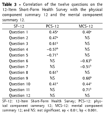 Internal consistency evaluates how each item correlates with the overall score measure of each questionnaire.(28) The evaluation of internal consistency of the SF-12 revealed that those questions that did not have a statistically significant correlation with the PCS-12 had a common denominator in that they addressed emotional and subjective aspects, which are probably more accurately assessed in the mental domain. Another possibility is that the correlation of those questions, although weak, was not identified due to limitations in the sample size, not excluding the possibility of a type II error. With regard to the questions that did not present a statistically significant correlation with the MCS-12, all of them addressed aspects related to physical capacity and pain, which are certainly more accurately assessed in the physical domain.