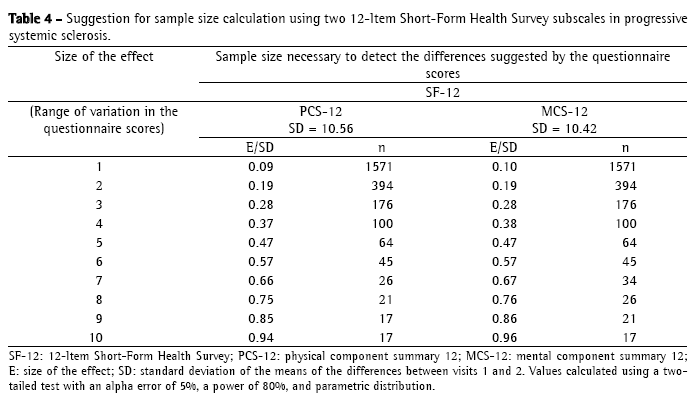 We have built a table to be used as a basis for planning future studies that will use the SF-12 as an outcome measure for the evaluation of quality of life in outpatient clinics for ILDs. In this table, the various sample sizes were obtained by estimating the size of the effect to be detected, considered as the variation in the score for each domain after an intervention (which ranged from 1 to 10 points for each score), taking into account the standard deviation obtained in this study. The suggestions for sample size calculation are described in Table 4.