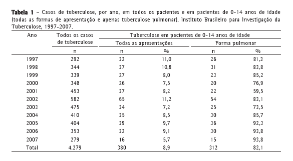 IntroduçãoA tuberculose é um problema de saúde significativo no Brasil, país que foi classificado como um dos vinte países do mundo com as maiores taxas de incidência da doença. Em 2009, o Programa Nacional de Controle da Tuberculose relatou 85.000 casos de tuberculose (aproximadamente 45 casos por 100.000 habitantes) à Organização Mundial da Saúde (OMS).(1) Entre 2005 e 2009, a incidência diminuiu 2,9% por ano.(1) No Brasil, 7% dos casos relatados afetaram crianças ou adolescentes (0-14 anos de idade); no estado da Bahia,(2) estima-se que essa proporção seja ainda maior, com 15-20% dos casos afetando crianças ou adolescentes.(3) Devido à dificuldade do diagnóstico, acredita-se que se trata de uma subestimativa da real prevalência da tuberculose. O diagnóstico é complexo, pois muitas vezes os resultados para BAAR são negativos.(4)