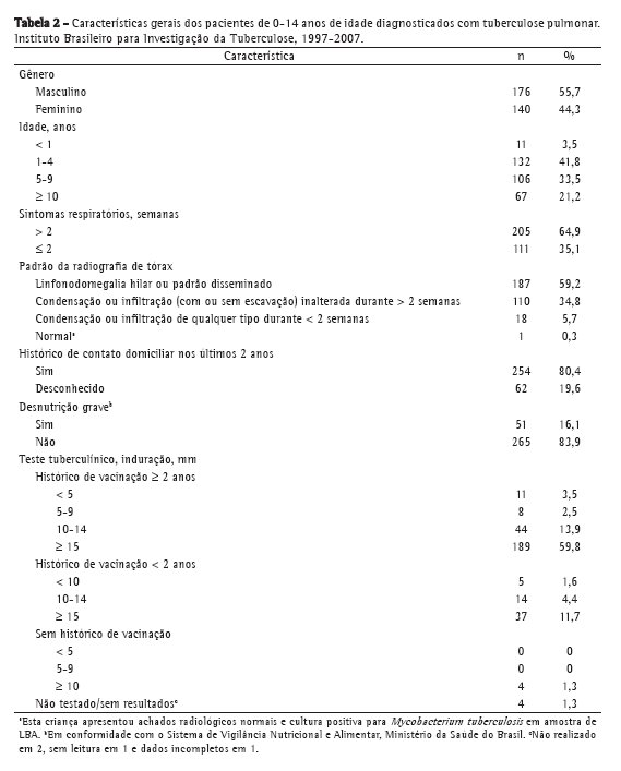 Dos 316 pacientes, 254 (80,4%) apresentaram histórico de contato domiciliar com um adulto positivo para BAAR nos últimos dois anos, e 267 (82,2%) apresentaram estado nutricional adequado (peso acima do percentil 10).