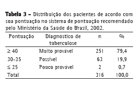 De acordo com o sistema de pontuação do MSB (Tabela 3), 251 (79,4%) dos pacientes de nossa amostra muito provavelmente tinham tuberculose (escore: ≥ 40), 63 (19,9%) possivelmente tinham tuberculose (escore: 30-35) e 2 (0,7%) pouco provavelmente tinham tuberculose (escore: ≤ 25). Com um ponto de corte de 30, a sensibilidade do sistema de pontuação proposto pelo MSB foi de 99,3%.
