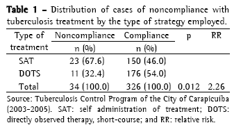 Objective: To determine treatment noncompliance rates among patients participating in a municipal tuberculosis control program and to identify the variables related to noncompliance depending on the type of treatment strategy used. Methods: A longitudinal non-concurrent cohort study was carried out involving two cohorts of patients participating in the Tuberculosis Control Program of the city of Carapicuíba, Brazil. The first cohort comprised 173 patients with tuberculosis treated from January 1, 2003 to December 31, 2003 using self administration of treatment, and the second comprised 187 patients with tuberculosis treated from July 1, 2004 to June 30, 2005 using the directly observed therapy, short-course strategy. Results: Noncompliance rates decreased from 13.3% (self administration of treatment) to 5.9% (directly observed therapy, short-course), a significant difference (p < 0.05). For the self administration of treatment strategy, the variables significantly associated with treatment noncompliance were as follows: being an unregistered worker (relative risk [RR] = 3.06); retreatment (RR = 2.73); alcoholism (RR = 3.10); and no investigation of contacts (RR = 8.94). For the directly observed therapy, short-course strategy, no variables were significantly associated with noncompliance. Conclusion: The directly observed therapy, short-course strategy decreased noncompliance rates and produced better treatment outcomes, even when the risk factors for noncompliance were the same.