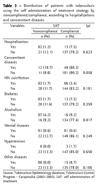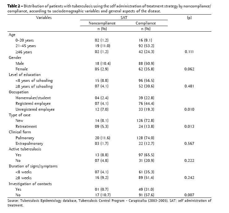 The objective of this study was to determine treatment noncompliance rates and the variables related to noncompliance of patients with TB participating in the Tuberculosis Control Program (TCP) of the City of Carapicuíba, comparing those using DOTS with those using self administration of treatment (SAT).