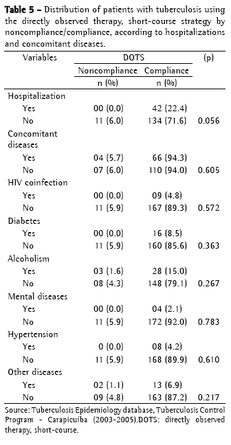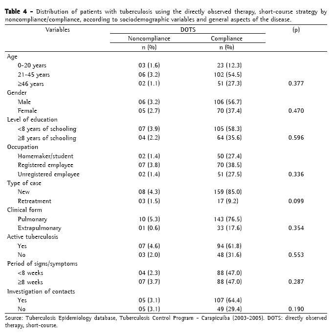 After the implementation of DOTS and the resulting decrease in noncompliance rates, no association between noncompliant patients using DOTS and any of the variables studied was found, which might be attributable to the lower number of noncompliant patients. In general, the lower noncompliance rate among patients using DOTS might be related to the more intimate, frequent and humanized contact between patients and the entire health care staff, resulting in a stronger bond between patients, their companions, families and the health care facility, as well as in better compliance with the therapeutic regimen and more favorable treatment outcomes, although the political administrative infrastructure as a whole also plays a role in improving the performance of the TCP.(8,11,14,17,19,25)