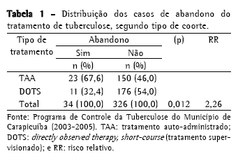 A Tabela 1 mostra que os casos de abandono foram significativamente mais freqüentes no TAA do que no DOTS. O risco de abandonar o tratamento de TB nos casos em TAA foi de aproximadamente 2,3 vezes os casos de abandono em DOTS.