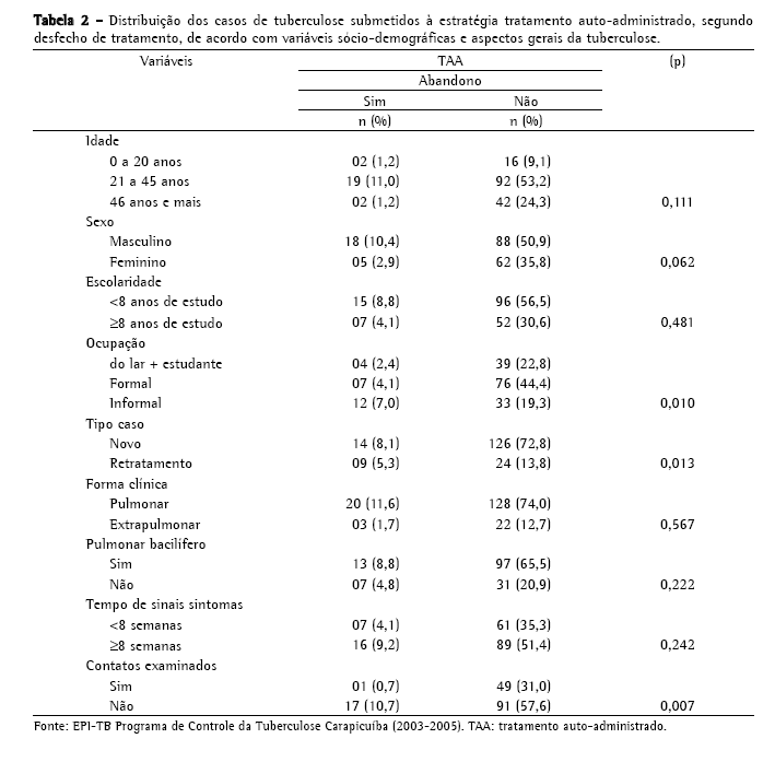 As Tabelas 2 e 3 mostram as possíveis variáveis relacionadas com os abandonos para os pacientes que utilizaram a estratégia TAA. Estar trabalhando na informalidade (RR = 3,06), ser caso de retratamento (RR = 2,73), não ter os contatos examinados (RR = 8,94) e ser alcoolista (RR = 3,10) contribuíram de maneira significativa para o abandono entre os que receberam a estratégia TAA.
