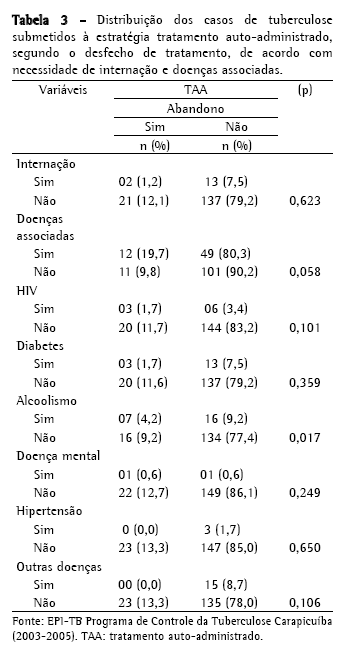 As doenças associadas mais prevalentes para ambas as coortes foram o alcoolismo, com prevalência de 15%, seguida pelo diabetes mellitus, com 8,9%; a prevalência de co-infecção pelo HIV foi de 5,2% para o TAA e de 4,8% para o DOTS, sem diferença estatística.