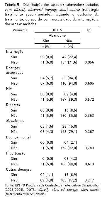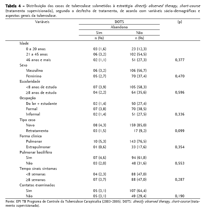As Tabelas 4 e 5 mostram que não houve associação significativa com o abandono do tratamento de TB para as mesmas variáveis, após a implantação da estratégia DOTS.