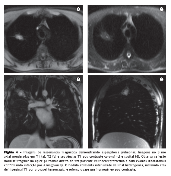 A RM é útil na caracterização das neoplasias pulmonares centrais com pneumonia obstrutiva ou atelectasia associada, diferenciando a massa tumoral das alterações secundárias, essas apresentando maior intensidade de sinal nas sequências ponderadas em T2, com aspecto mais homogêneo, devido ao acúmulo de secreções e de fluido, e com padrão de reforço diferente da lesão neoplásica.(34) Na aspergilose pulmonar invasiva, a RM é mais específica que a TC na caracterização das consolidações associadas a infartos hemorrágicos secundários à invasão vascular (Figura 4). As hemorragias aparecem como áreas de hipersinal T1, mais comumente periféricas, enquanto as imagens pós-contraste permitem identificar as áreas de inflamação ativa, necrose central e formação de abscessos. As características peculiares de sinal dos produtos de degradação da hemoglobina e de gordura também permitem que a RM auxilie no diagnóstico dos infartos pulmonares hemorrágicos, das hemorragias alveolares, como na síndrome de Goodpasture, e das pneumonias lipoides associadas à aspiração de óleo mineral.(35)