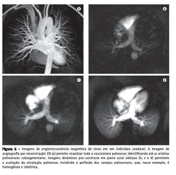 Utilizando as novas técnicas de angio-RM, principalmente as sequências GE 3D pós-Gd, atualmente já é possível identificar-se até as pequenas artérias pulmonares subsegmentares (de 4ª ordem) de um pulmão normal. Essa técnica permite a obtenção de imagens com alta resolução temporal, adquiridas a cada 1,0-1,5 segundos, que podem ser utilizadas também para o estudo de perfusão do parênquima pulmonar (Figura 6).(40) As sequências GE que mostram o fluxo sanguíneo com alto sinal, também chamadas de sangue brilhante (sequências GE balanceadas, cine-RM e contraste de fase), permitem a avaliação dos grandes vasos torácicos sem a necessidade da administração de contraste, além de possibilitarem a avaliação dinâmica e a mensuração do fluxo nas artérias pulmonares e aorta, permitindo assim estudos não somente morfológicos, mas com o acréscimo de informações funcionais.(41)