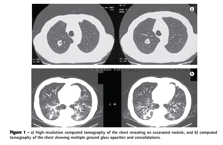 Discussion This was the first reported case of MAS in which the combination of excavated nodule, ground glass opacities and pulmonary consolidations was observed on an HRCT scan (Figure 1). This finding is important because it includes MAS in the differential tomographic diagnosis of pneumonia, lymphoma, pulmonary vasculitis, alveolar hemorrhage, tuberculosis, nocardiosis and fungal disease.(5-9)