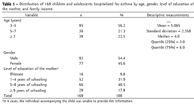 ResultsTable 1 shows some individual and family aspects of the 169 patients with asthma. The mean age of the patients was 5 years, 54.4% (92/169) being male and 45.6% (77/169) being female. Regarding maternal level of education, it was found that 9.8% (16/163) of the mothers were illiterate, and that 72.4% (118/163) had only 1 to 8 years of schooling.