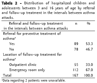 Regarding the follow-up treatment of asthma, the patients were asked whether they had ever been referred for outpatient treatment in the intervals between asthma attacks by any health professional in the emergency room, whether they had visited any health care facility regularly before being hospitalized, and whether they had received any prophylactic medication. The definition of prophylactic medication was that established in the III Brazilian Consensus on Asthma Management guidelines.(19)