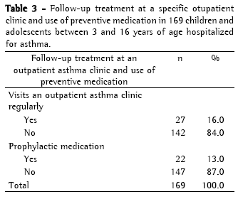 Therefore, we conclude that the rate at which such patients seek outpatient follow-up treatment for asthma is far from acceptable, which may be a reflection of the situation in which we find the Brazilian Unified Health Care System. The present study reveals that, among patients hospitalized for acute asthma, full access to treatment and to preventive medication is the exception.