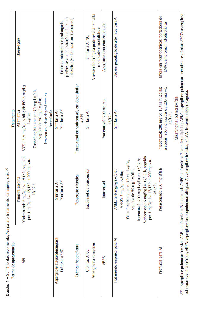 O uso empírico de anfotericina B lipossomal, voriconazol, itraconazol ou caspofungina é recomendado para pacientes de alto risco que apresentam neutropenia prolongada e febre persistente, a despeito da antibioticoterapia de amplo espectro (Quadro 1) enquanto a investigação diagnóstica é conduzida.(1)