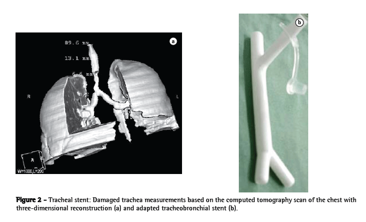 Os autores apresentam o caso de uma paciente com estenose traqueal distal recidivada após múltiplos procedimentos de ressecção da traquéia. A paciente foi submetida à inserção de uma prótese traqueobrônquica do tipo T-Y para o manejo da obstrução da via aérea distal. A prótese foi adaptada de acordo com as especificações obtidas por meio da tomografia computadorizada do tórax com reconstrução tridimensional.