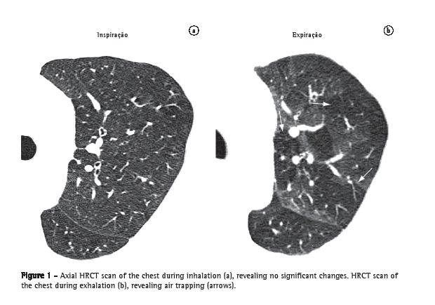 Bronchiectasis is irreversible bronchial dilation, which can be focal or diffuse. It generally results from chronic infection, proximal airway obstruction or congenital bronchial abnormalities. The morphological findings seen on HRCT scans (Figure 12) are as follows: the internal diameter of the bronchus is larger than the diameter of the adjacent pulmonary artery (signet-ring sign); loss of normal bronchial tapering, defined as the maintenance of the bronchial diameter for more than 2 cm, distally to the bifurcation ("tram tracks"); and identification of airway less than 1 cm from the pleural surface. Bronchiectasis is frequently associated with the thickening of the bronchial walls, mucoid impaction and small airway changes.(26,27) Pathology defines three types of bronchiectasis, according to the appearance of the affected bronchus, namely cylindrical, varicose and vesicular (or cystic).