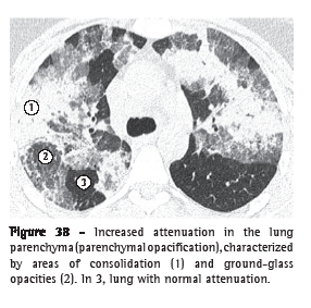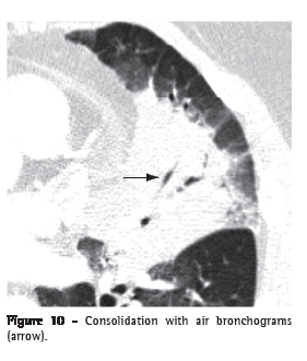 Air spaces correspond to the spaces bounded by the alveolar walls, including the alveolar sacs, alveolar ducts and the alveoli on the walls of the respiratory bronchioles.(43) This term can be used in association with consolidation, opacity or nodules to characterize the origin of such lesions, which fill these spaces with liquid or cells. The air bronchogram sign (Figures 3 and 10) is the trademark of air space filling.