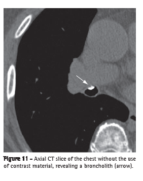 A broncholith is a calcified peribronchial lymph node that erodes into the adjacent bronchus. It is often secondary to infections by Histoplasma sp. or Mycobacterium ­tuberculosis. On CT scans, a broncholith is seen as a small focus of calcification within or adjacent to the airway, being more common in the middle lobe bronchus (Figure 11). Mucoid impaction, bronchiectasis or atelectasis might be observed distally.(24,25)