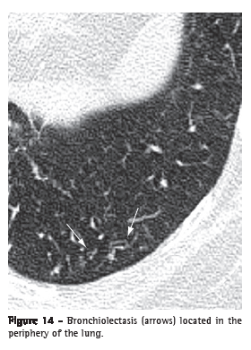 Bronchiolectasis refers to the dilatation of a bronchiole. It is analogous to bronchiectasis, but it affects an airway of much smaller diameter, identified in the periphery of the lung (Figure 14). Bronchiolectasis manifests as rounded or tubular structures, generally located in the periphery of the lung, with thick walls or filled with secretion (see also Tree-in-bud pattern).(3,7) It can also be combined with other pulmonary opacities and to the distortion of the parenchyma in cases of fibrosis.