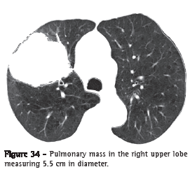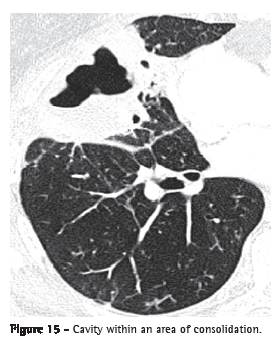 Cavities are gas-filled spaces, with or without air-fluid level, within a nodule, mass or pulmonary consolidation. They are typically produced by the expulsion or drainage of a necrotic part through the airway (Figure 15) or to the pleural space. The walls of a cavity are usually irregularly outlined and measure over 1 mm in thickness. The word "cavity" is not synonymous with "abscess". Although the term "cavitation" can be translated to Portuguese as cavitação or ­escavação, the term cavitação has a different meaning in Portuguese and therefore should not be used as a synonym for escavação in this context.(7)