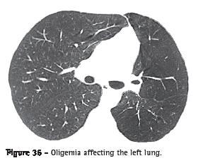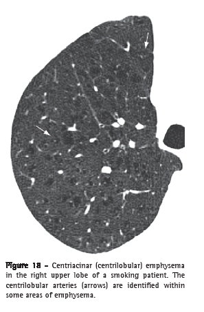 Centriacinar emphysema is the destruction of the walls of the centriacinar alveoli combined with an increase in respiratory bronchioles and associated alveoli. Centriacinar emphysema is the most common form of emphysema in cigarette smokers. Tomographic findings are centrilobular areas of decreased attenuation, usually without visible walls, having nonuniform distribution and predominantly located in the upper pulmonary regions (Figure 18).(37,38) The centrilobular arteries can frequently be identified within the hypodense areas. The term centrilobular emphysema is commonly used as a synonym in CT.