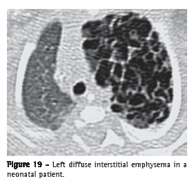 Interstitial emphysema is characterized by the air dissection of the pulmonary interstitium, typically located on the bronchovascular sheaths, interlobular septa and visceral pleura; it is more frequently identified in neonates receiving mechanical ventilation (Figure 19). Interstitial emphysema is seldom recognized radiographically in adults and is rarely seen on CT scans. The process appears as areas of air density with perivascular distribution, peribronchovascular distribution or distributed along the interlobular septa (Figure 20), or as rounded areas of low attenuation simulating small bullae or cysts (Figures 19 and 20).(40,41)