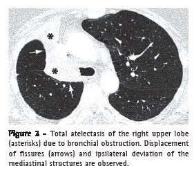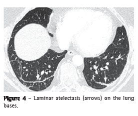 Atelectasis is the reduction in lung volume caused by the reduced aeration of all or part of the lung.(11) It is observed as a combination of reduced attenuation of the lung parenchyma and reduction in lung volume, characterized by the displacement of fissures, of mediastinal structures or of the diaphragm and by the approximation of the bronchovascular structures of the affected parenchyma (Figures 2 and 3).(3,12) With regard to distribution, the following types of atelectasis can be found: subsegmental, segmental, lobar or whole lung. Atelectasis can also be qualified, according to its form, as plate-like (discoid) or rounded.(13) In studies using iodinated contrast material, the homogeneous enhancement of the lung parenchyma can aid in the differentiation between atelectasis and consolidation (Figure 3). The term "collapse" can be used in cases of total atelectasis of one lobe or whole lung atelectasis.