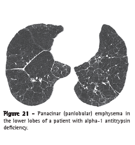 Panacinar (panlobular) emphysema involves all portions of the acinus and, reasonably uniformly, the secondary pulmonary lobule. It predominates in the lower lobes and is the form of emphysema associated with alpha-1 antitrypsin deficiency. Panacinar emphysema is seen on CT scans as a generalized decrease in the attenuation of the lung with a reduction in the diameter of the blood vessels in the affected areas, with or without distortion of these vessels (Figure 21).(37,38,42) Severe panacinar emphysema can coexist and merge with severe centriacinar emphysema. On CT scans, it can be indistinguishable from the findings of severe constrictive bronchiolitis.